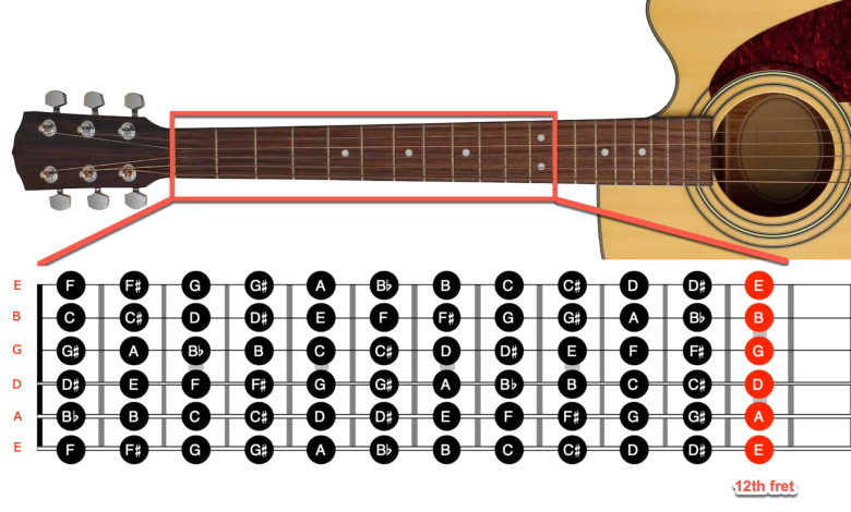 - با استفاده از جدول بالا، نتها را روی گیتار پیدا کنید.